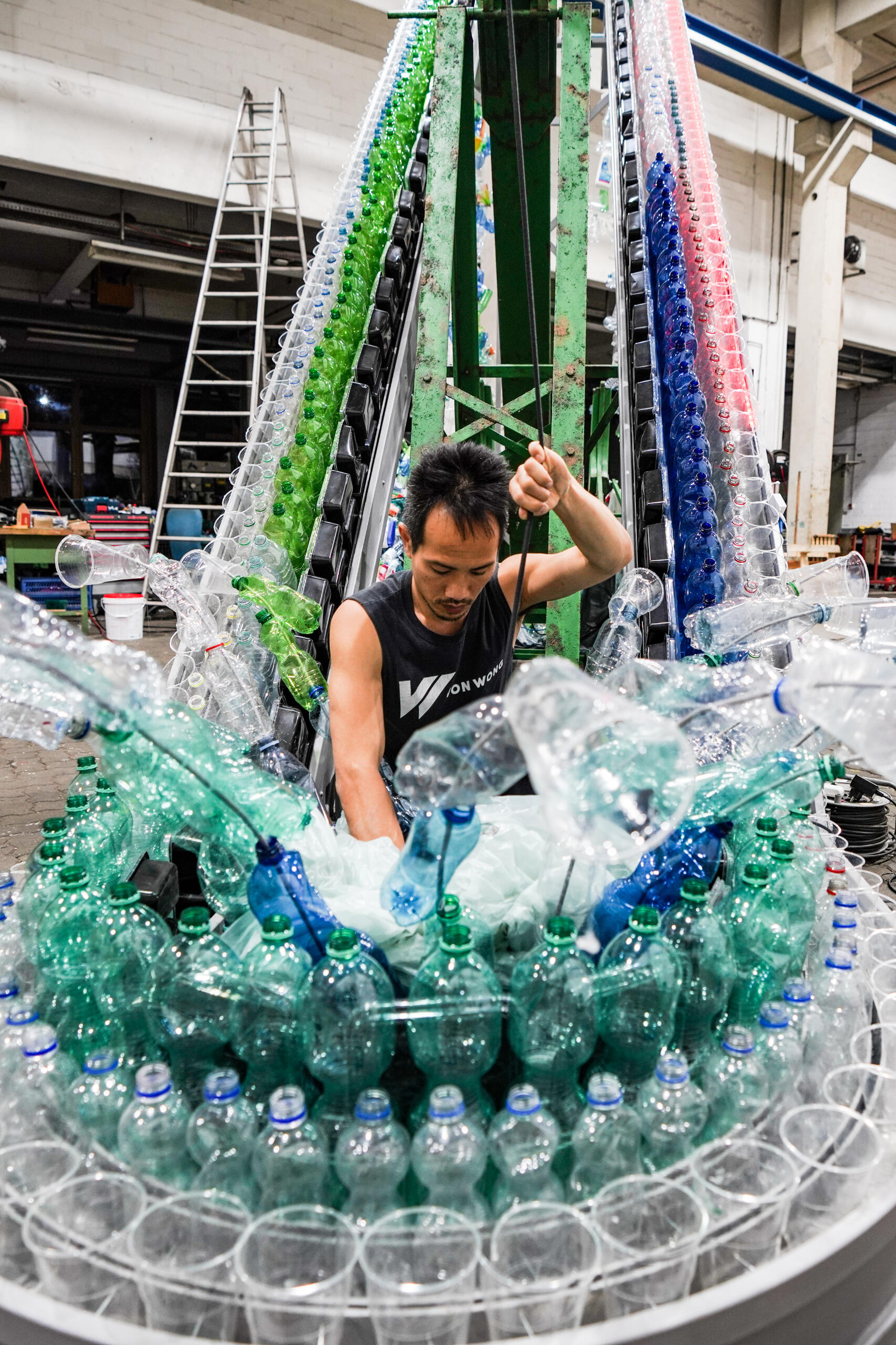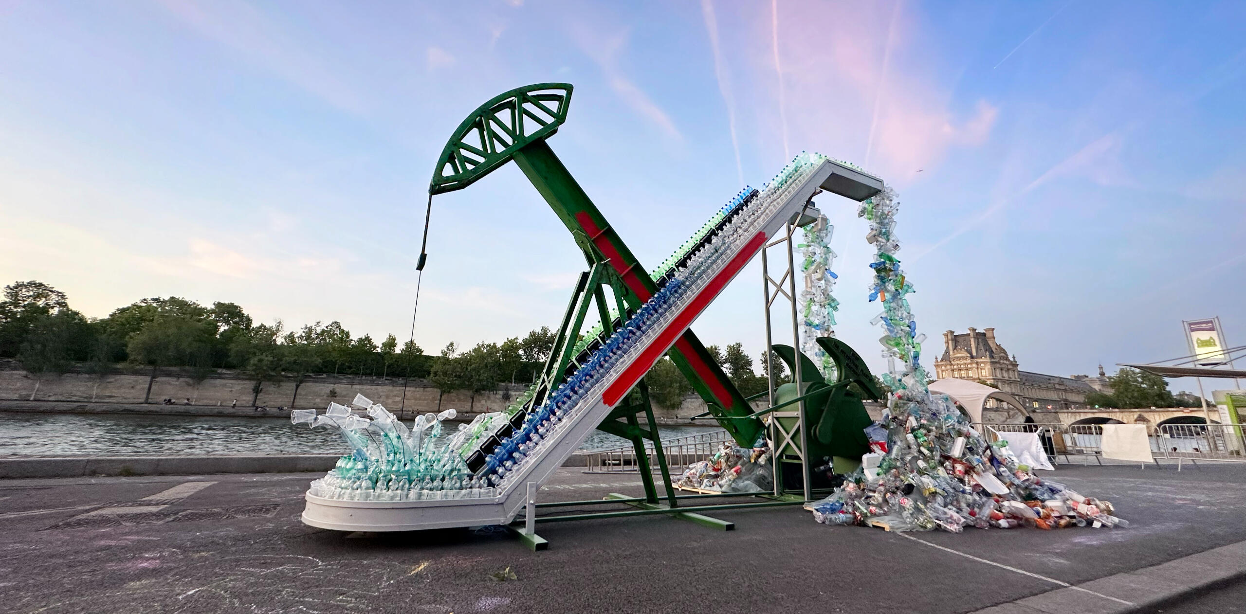 The art installation was initially conceptualized with the help of Dana Waldman and Jeremy Lizandier.From there, the production team of Greenpeace Germany helped bring the idea to life.They laser-cut, painted, assembled, and motorized the entire art installation - to get it ready for a global tour - and sourced used plastics from airports and cafeterias to help create the illusion of both an endless plastic supply chain, and a colossal pile of waste.The GreenpeaceUSA's global plastics team then found a highly visible location next to the Musee d'Orsay where activations are being hosted all week long during the Global Plastics Negotiations.Photos captured by Von Wong, Noel Rasch and Daniel Müller / Greenpeace